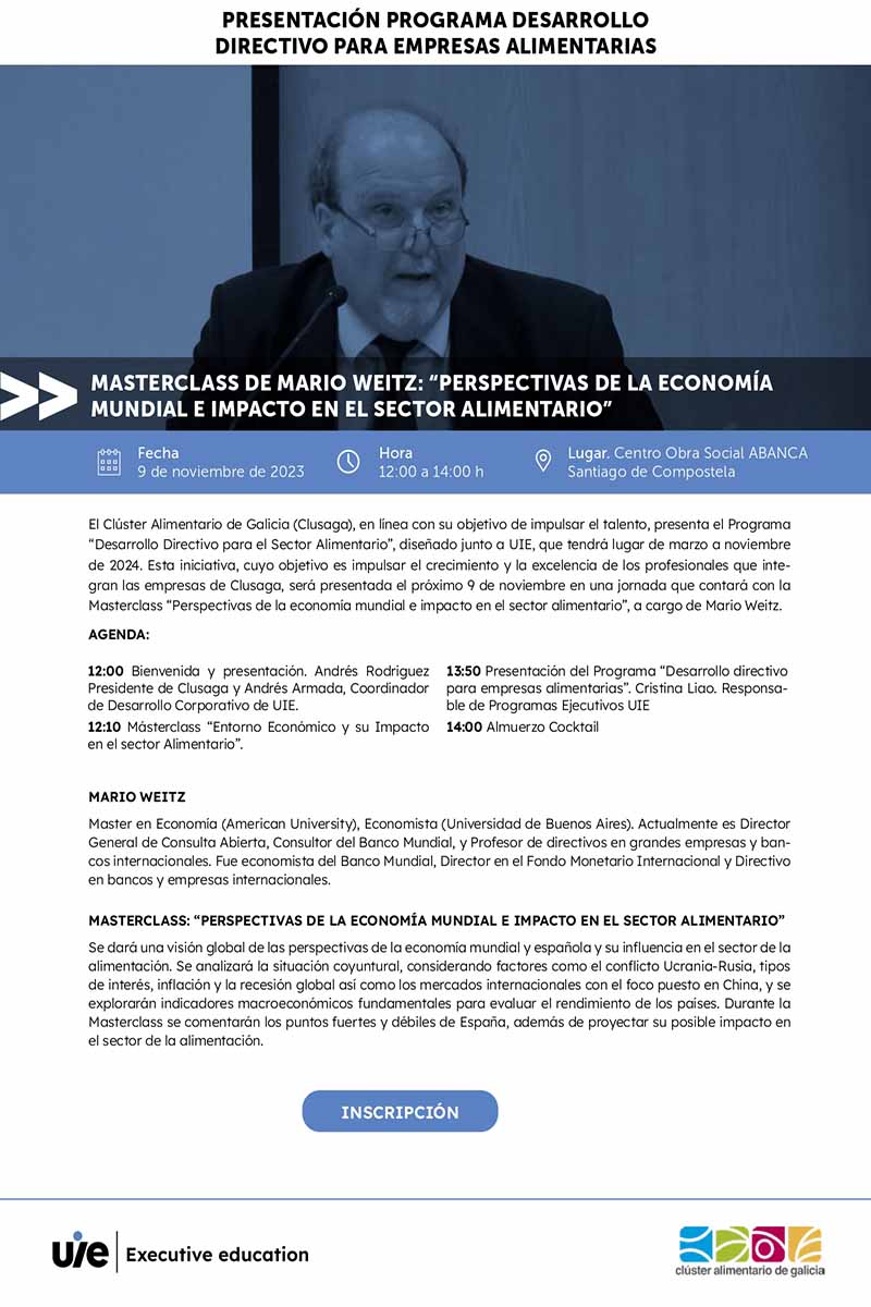 A sesión será de 12:00 a 14:00 horas no Centro Abanca Obra Social (Praza Cervantes, Santiago de Compostela) e será impartida polo economista, director xeral de Consulta Aberta e exconsejero do Fondo Monetario Internacional Mario Weitz. Na charla ofrecerase unha visión global da economía mundial e española, incidindo na súa influencia no sector da alimentación.