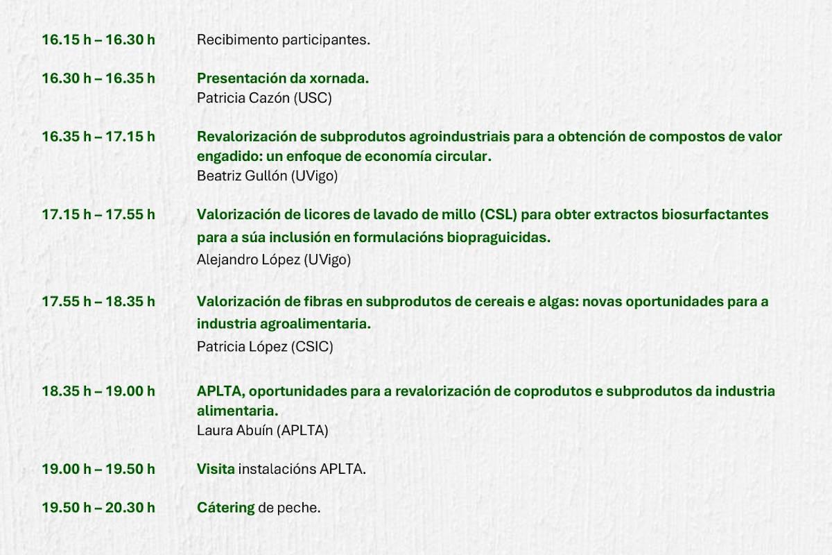 - Laura Abuín, licenciada en Ciencia e Tecnoloxía dos Alimentos e técnica superior de investigación da APLTA, achegará un enfoque práctico sobre o aproveitamento práctico de coproductos da industria alimentaria.