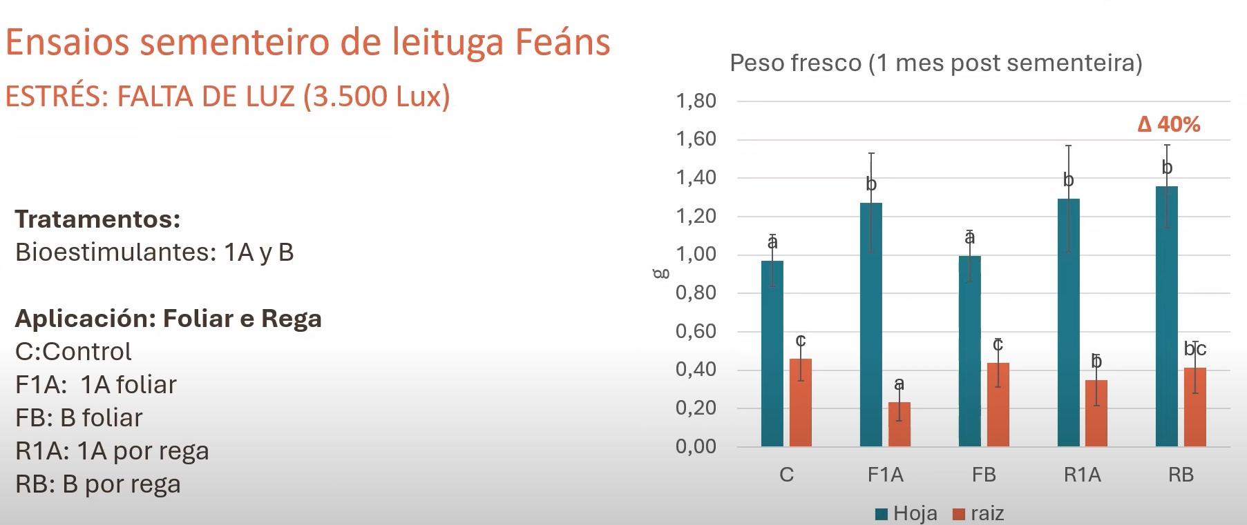 Además hicieron ensayos de crecimiento de plántula de una variedad comercial de lechuga. En este caso, el aporte del bioestimulante sin condiciones de estrés no supuso diferencia sobre el peso unitario de cada lechuga. Sin embargo, cuando esas plantas padecen un estrés de salinidad, con el aporte del bioestimulante se consigue un crecimiento del 86% de la parte aérea y del 24% de la raíz.