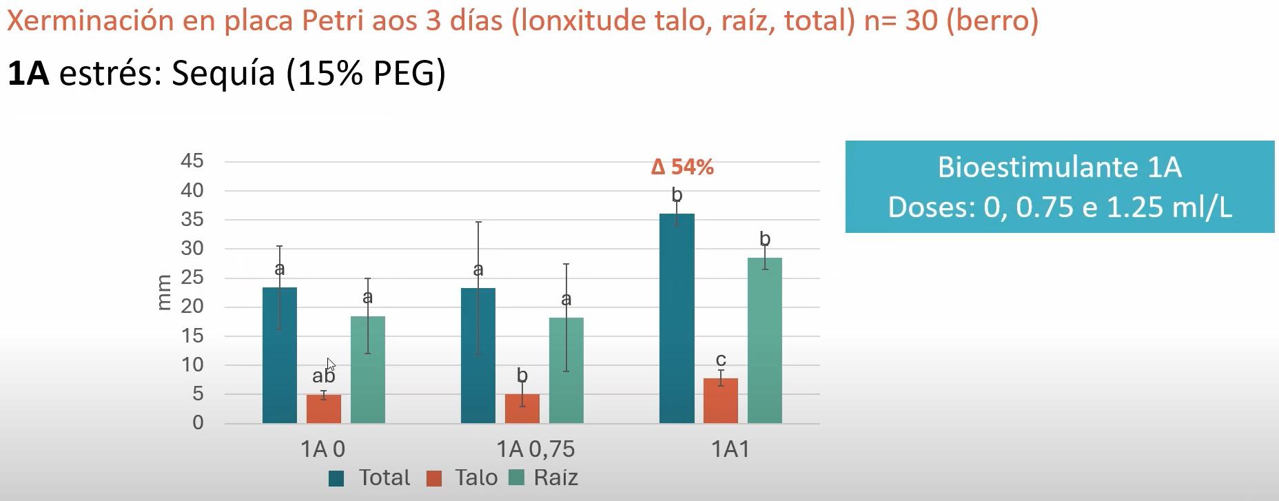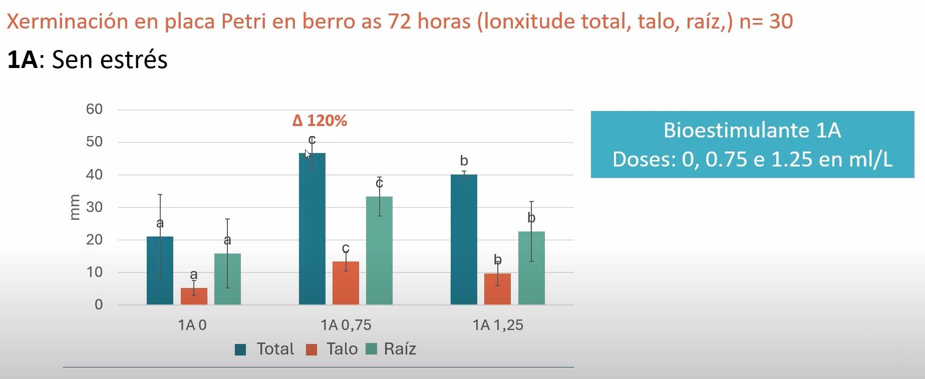 En las primeras pruebas realizadas en laboratorio sobre la germinación de berro en placas de Petri y sin condiciones de estrés, el uso de bioestimulantes genera un crecimiento total tanto de tallo y raíz del 120%, con un mínimo aporte de 0,075 mililitros por litro. Se trata de un ensayo realizado en 72 horas en las que se trabaja con unas muestras de 30 semillas y se mide la longitud total, el tallo y la raíz.