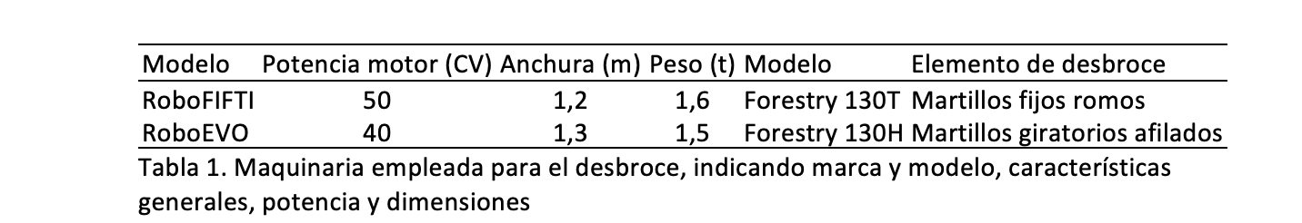 Los valores de rendimiento obtenidos son muy superiores a los que se habían reportado previamente para RoboEVO (rango de 4,4 a 12,3 h/ha para tiempo de trabajo efectivo). Adicionalmente, debe considerarse que en esas cifras corresponden a un monte muy llano y con vegetación fundamentalmente de zarza. El mejor rendimiento obtenido por RoboFIFTI se debe muy posiblemente al implemento de desbroce empleado en este caso, mucho más adaptado a vegetación leñosa.