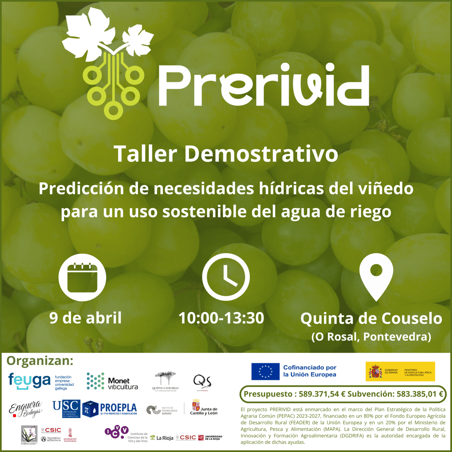 El Grupo Operativo Supraautonómico PRERIVID celebrará, el miércoles 9 de abril de 10:00-13:30h en Adega Quinta de Couselo (O Rosal, Pontevedra), un taller demostrativo en formato presencial para dar a conocer los últimos avances del proyecto “Predicción de necesidades hídricas del viñedo para un uso sostenible del agua de riego”. Este consorcio nace en 2024 con el fin de hacer frente a los retos que plantea el cambio climático en la producción de uva y vino.